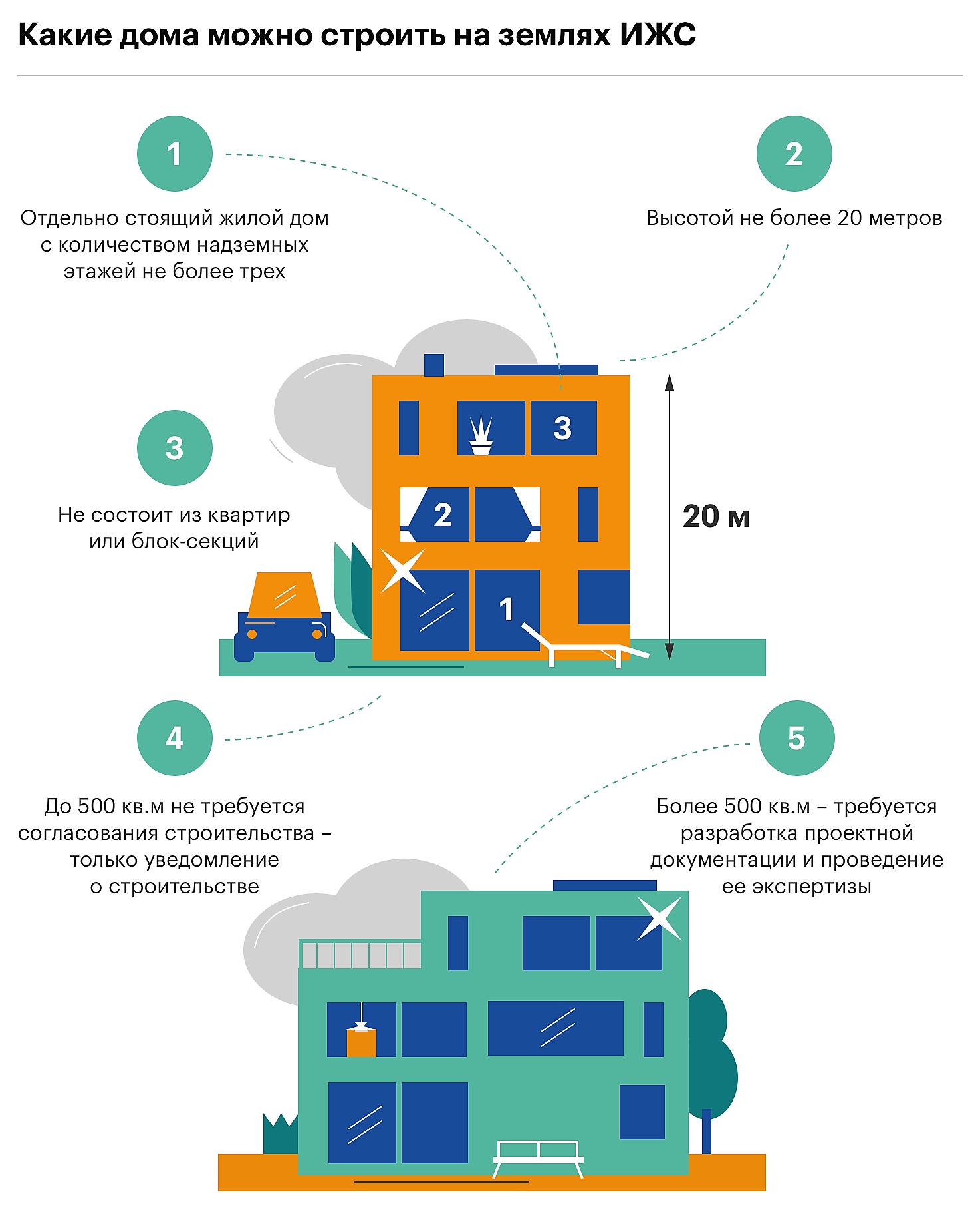 В проекте закона, подготовленном Минстроем, устанавливаются единые требования к параметрам и процедуре строительства индивидуальных жилых строений (ИЖС) в населённых пунктах и на дачных участках. Согласно документу, дом должен быть отдельно стоящим и не состоять из отдельных квартир или блок-секций (подъездов). Его высота не должна превышать 20 метров с количеством надземных этажей не более трёх.