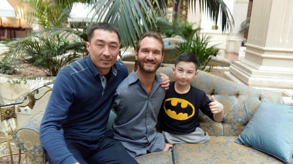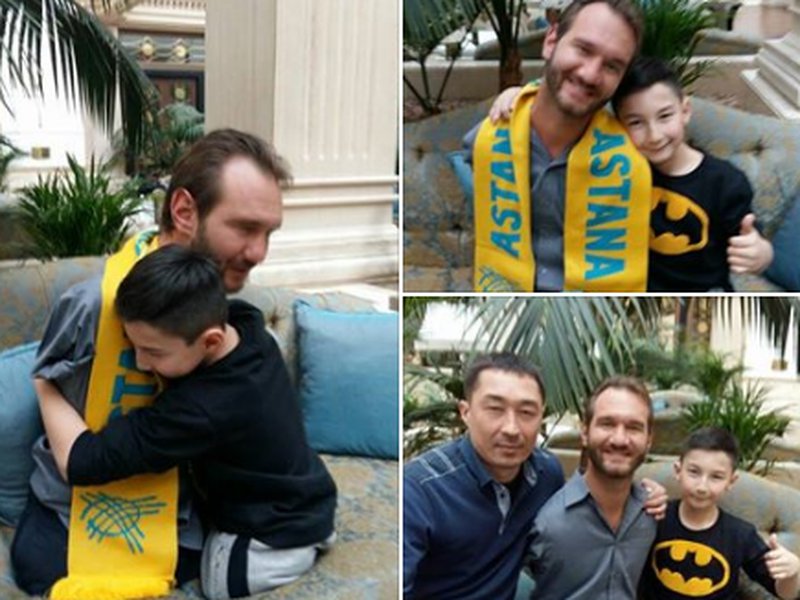 «На этой встрече мы поделились с Ником успехами — рассказали, что Али играет в футбол, занимается плаванием. Когда мы показывали видео, как Али забивает гол, Ник Вуйчич так смеялся. Он был удивлен, что человек без ног может такое. Али был очень счастлив. Они веселились, шутили, обнимались и фотографировались», — сообщил отец мальчика Азамат Турганбеков.