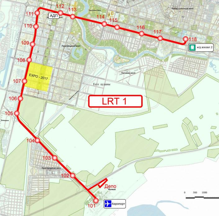 Согласно плану, LRT соединит аэропорт и новый железнодорожный вокзал «Нурлы жол». Протяженность эстакады составит 22,4 километра, всего будет 18 станций в черте города и 19 единиц подвижного состава. По проекту надземное метро сможет перевозить до 146 тысяч человек в сутки.
