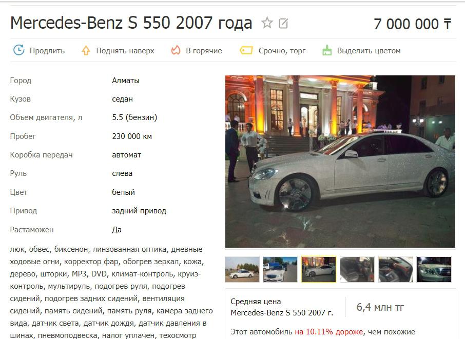 Ранее другой Mercedes-Benz S500, обклеенный миллионом стразов Swarovski, был выставлен на продажу. Как рассказала хозяйка авто, на его украшение она потратила 33 миллиона тенге и оценивала его в 118 888 долларов. На данный момент этот автомобиль продается за 20 миллионов тенге.