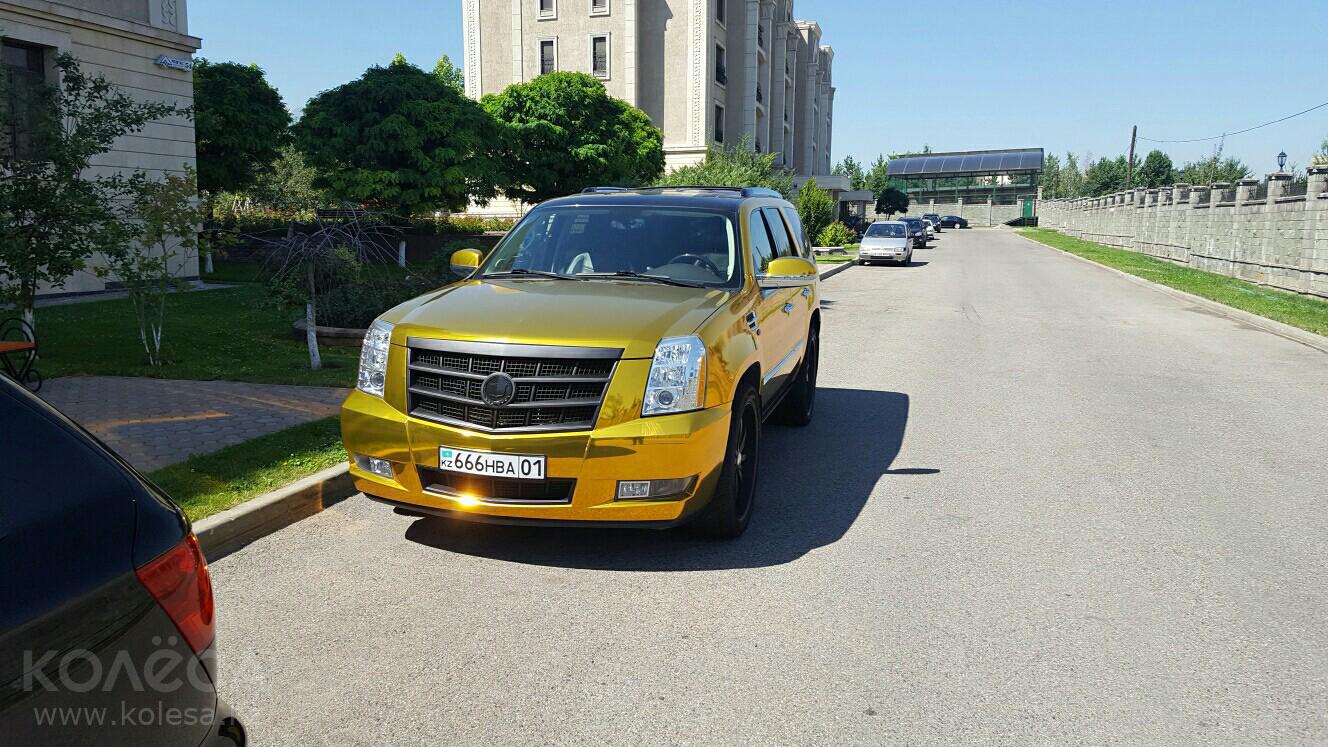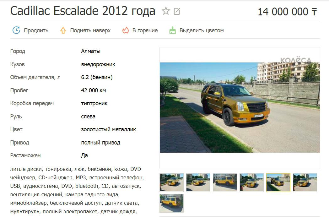 Другое оригинальное авто, которое удалось найти в продаже, — «золотой» Cadillac Escalade 2012 года за 14 миллионов тенге.