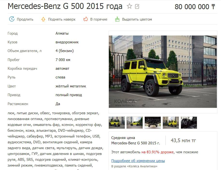 Конкурент этого люксового Gelandewagen — Mercedes-Benz G 500 2015 года за 80 миллионов тенге. Основной особенностью этого авто можно назвать его кислотный цвет.