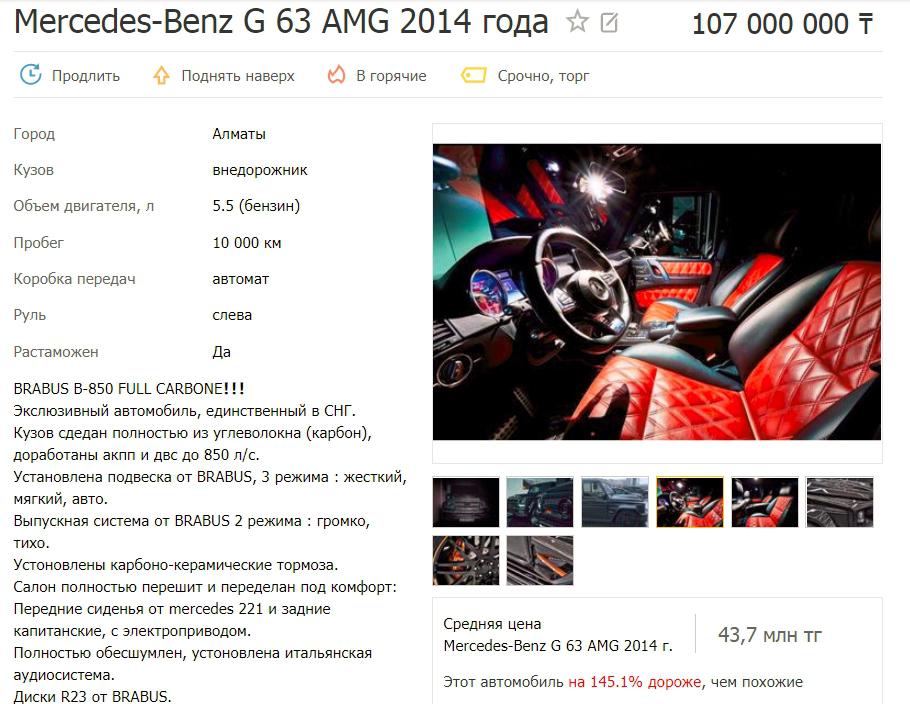 Одним из первых и самым дорогим лотом, который удалось найти, стал Mercedes-Benz G 63 AMG 2014 года за 107 миллионов тенге.