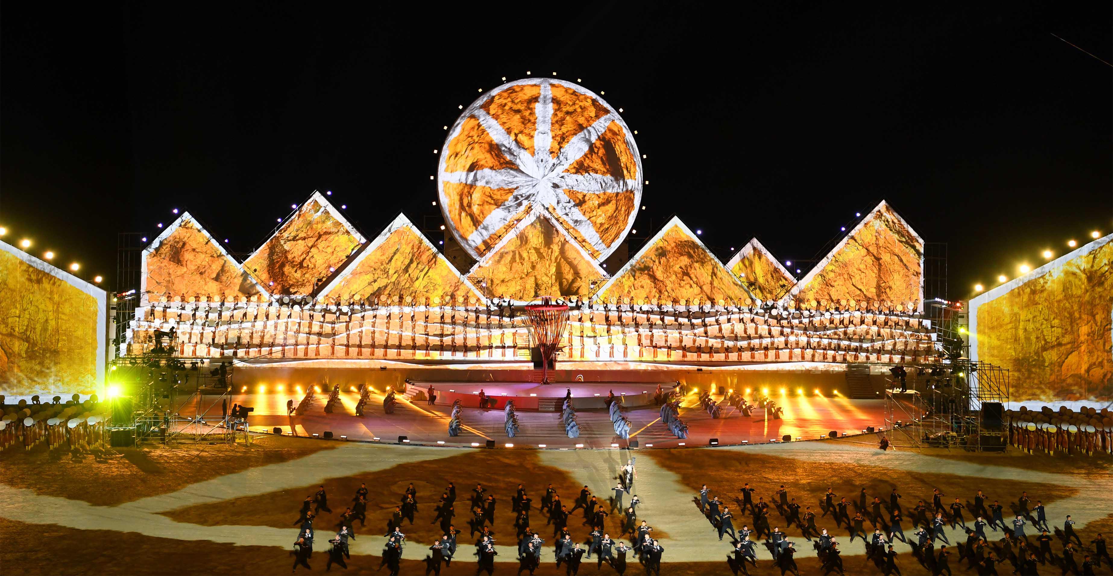 В театрализованном представлении с использованием 3D-графики выступили более тысячи актеров, музыкантов, певцов, наездников и спортсменов, которые  продемонстрировали цирковые номера, мастерство джигитовки, огненное шоу и акробатические трюки.