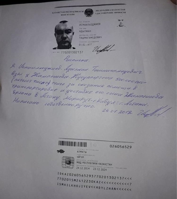 «Не знаю, как так можно. Отец, конечно, в таком состоянии своим любящим сердцем. Ну, уже ждут они, просто не получается с рейсами. В Кабуле высокий уровень террористической опасности, поэтому мало кто летает. Тот рейс, который летал, там расстреляли, может, слышали, бортпроводников, пилотов, стюардесс. Поэтому в эту пятницу он тоже не прилетит. Регулярный рейс Кабул-Алматы. И они сказали, что у них самолет, он летит, дали номер борта, какое-то название самолета. Он написал расписку. Указал удостоверение личности, взял 500 тысяч тенге. И пропал. Но отец не сказал нам ничего. А когда уже он сказал нам об этом, мы начали пробивать информацию и узнали, что вообще такого самолета нет, и пилота такого нет. На расписке написано, вчера это было, 24 января. Он сказал, что завтра утром, чтобы мы объявили всем родным, близким, что похороны будут в субботу. А в пятницу они обещали вылететь и рано утром привезти тело», — продолжила родственница.