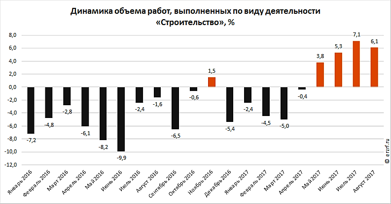 По данным Росстата, в августе 2017 года объём работ, выполненных по виду деятельности «Строительство», вырос на 6,1% по сравнению с аналогичным показателем августа 2016 года (в сопоставимых ценах). На это обратили внимание наши коллеги с портала ЕРЗ.