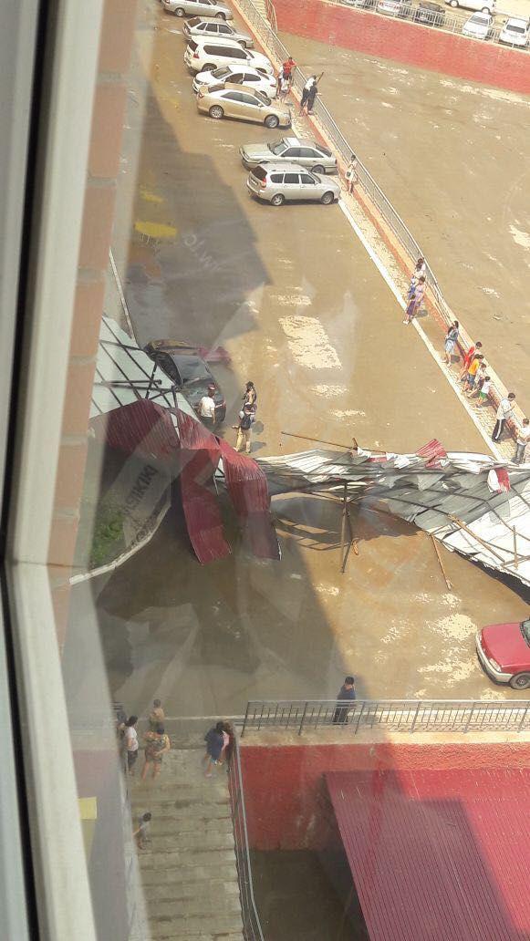 Кроме того, сильный ветер сорвал кровлю с трибуны Центрального стадиона. По сообщению ДЧС, порыв произошел на площади 34 квадратных метров. Кровля при падении повредила стекла рядом стоящего ресторана «Рахат». Жертв и пострадавших также нет.